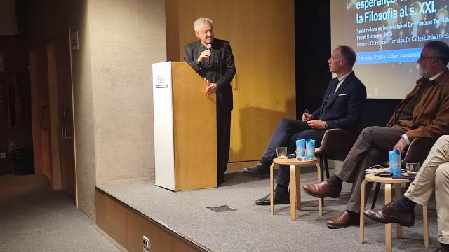 Los ponentes hablaron del sentido y los retos de la práctica de la filosofía de hoy, la necesidad de explicitar desde dónde se puede intervenir en un diálogo cultural y de ideas y la posibilidad de pensar el presente con esperanza. Francesc Torralba explicó que "la aspiración de una filosofía sin fuente de inspiración, sea laica o religiosa, no existe", y que esta identificación "a veces me ha abierto puertas y otras me ha cerrado, pero el más honesto es decir desde dónde partimos”. Por su parte, Carles Llinàs enmarcó el premio Ratzinger en la propuesta que siempre ha formulado Torralba desde el humanismo cristiano y "hablando de Dios desacomplejadamente". Santi Vila destacó algunos elementos que debe aportar el pensamiento filosófico a la sociedad, y remarcó que hoy pensar es un antídoto contra la polarización por su capacidad de identificar "lo que une a la condición humana".