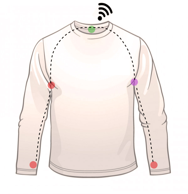 La solución tecnológica aportada por los investigadores del GTM se trata de un wearable que consta de una serie de sensores repartidos en puntos seleccionados para medir la temperatura corporal. Dos de los sensores están colocados en las mangas para recoger la temperatura periférica, y otros dos en las axilas, monitorizando la temperatura central del cuerpo. Además, uno de ellos mide la humedad, parámetro determinante para conocer la sensación térmica. Mediante un microcontrolador, se recogen todos los datos y se sincronizan para enviarlos a una aplicación móvil que almacena los datos en el Cloud, y a la vez permite su consulta y procesado.